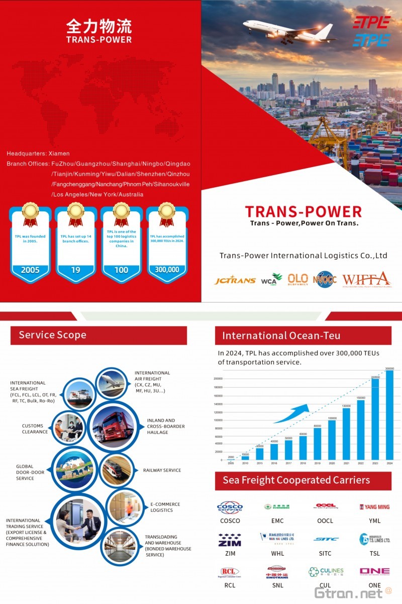 Trans-PowerInternational Logistics Co., Ltd 成立于 2005 年,是经国家运输部注册的顶级国际货运代理,OfCommerce.It 拥有国家运输部批准的 (NVOCc) 资格,并通过了 LS0900L 质量管理体系认证。 经过多年的经验和探索,总结出先进的技术和管理,我们以系统化、标准化、全方位的良好服务赢得了广大客户的高度赞誉,并在 TheIndustry.By 建立了一贯的优秀形象,现在,我们公司立足中国,建立了覆盖200多个主要港口的代理网络,能够实现端到端的贸易和转运服务。