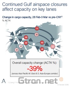 Regional capacity losses highlight the scale of the disruption. Cargo lift within the Gulf region has dropped dramatically, while South Asia has also seen significant declines. Parts of the eastern Mediterranean and surrounding regions have experienced notable reductions as well.