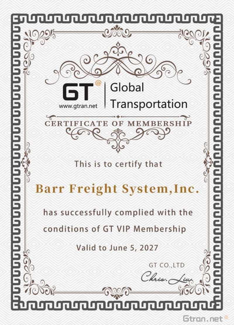 We are here to announce that Barr Freight System, Inc. joins as a GT VIP member in the USA.